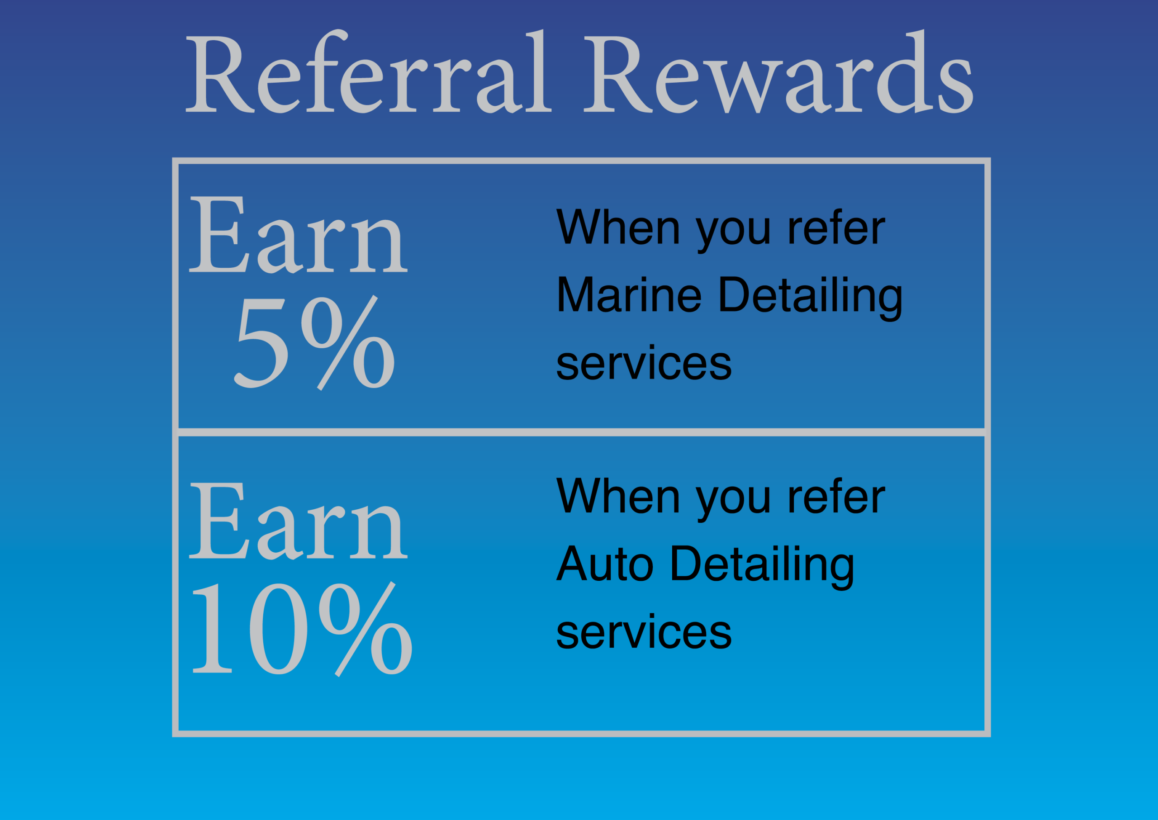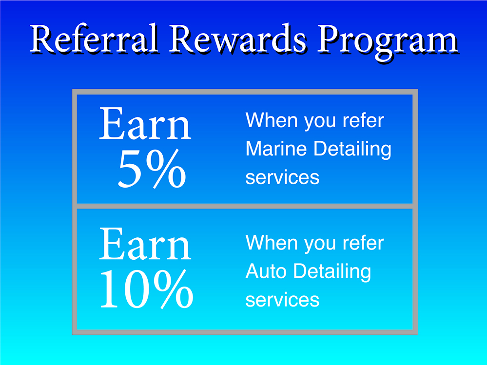 To show you our appreciation we developed this program to reward you for referrals you send us. For every pre-tax dollar a referral spends on Marine Detail services, you receive 5% credit towards future services. For every pre-tax dollar a referral spends on Auto Detail services, you receive 10% credit towards future services.